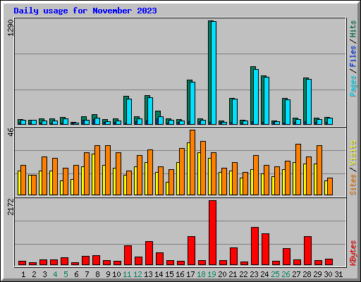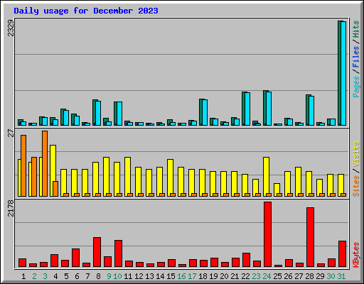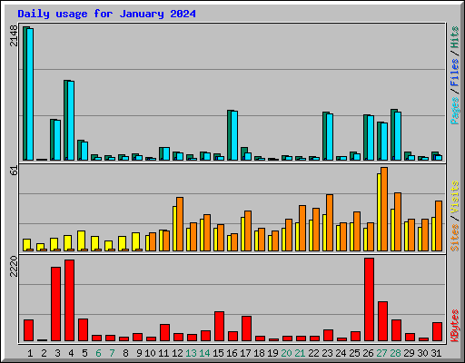 | Day | Hits | Files | Pages | Visits | Sites | KBytes | ||||||